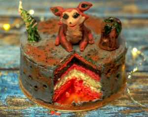 - Po schłodzeniu, do rondelka wlewamy mleko i cukier, podgrzewamy aż do momentu rozpuszczenia cukru. Masło ubijamy, wlewamy powoli syrop mleczny, na koniec dodajemy barwnik i masło w proszku. Tynkujemy tort i ozdabiamy tort.