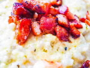 - Boczek pokroić w paseczki, zrumienić i ułożyć na wierzchu. Smacznego!