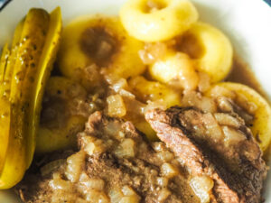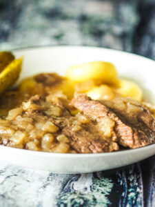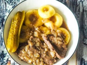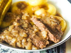 - Wołowinę kroimy na cienkie plastry, nacieramy, solą i pieprzem. W rondelku rozpuszczamy masło i gdy zacznie skwierczeć, wkładamy każdy kawałek mięsa i obsmażamy z obu stron. Następnie wyciągamy na talerz i wkładamy pokrojoną w piórka cebulę, i dwa ząbki czosnku. Szklimy i następnie wkładamy z powrotem mięso. Zalewamy wodą tak aby mięso było przykryte. Dokładamy liść laurowy oraz ziele angielskie i gotujemy na średnim ogniu przez 2-3h.